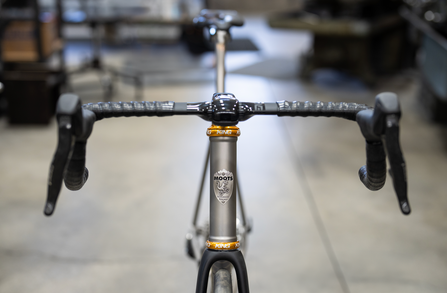 The first Moots, a custom steel road frame, rolls out the front door in Steamboat Springs, CO.