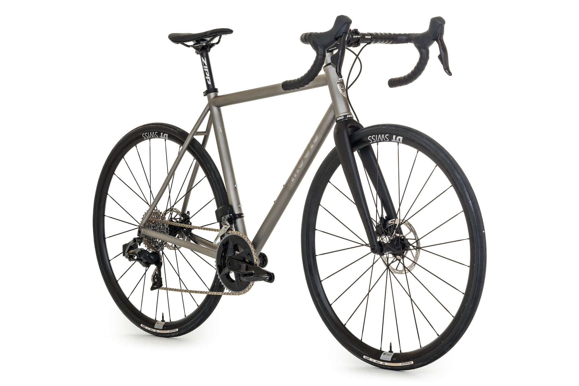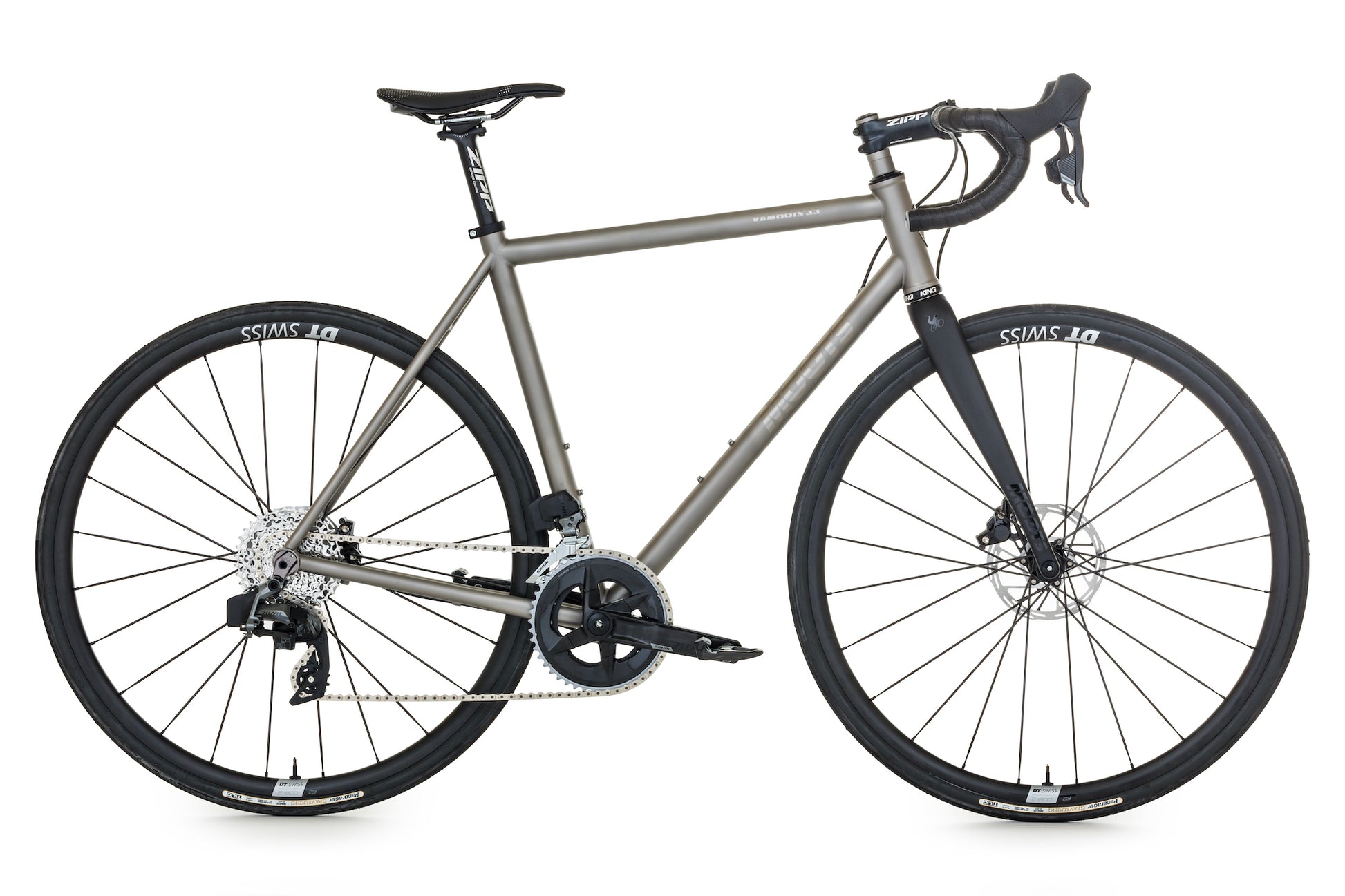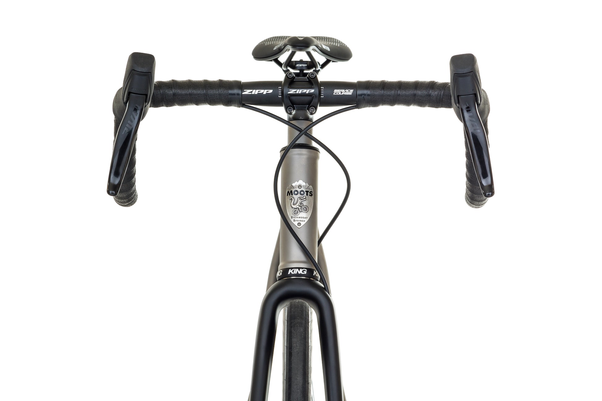 Frame: Vamoots 33Kit: Sram Rival 2x AXSFinish: BrushedFork: Moots carbon RCSHeadset: Chris KingHandlebar: Zipp Service Course 70 ERGOStem: Zipp Service CourseSeat Post: Zipp Service CourseWheels: DT Swiss E1800 Spline AL tubelessSaddle: WTB Gravelier SL Fusion/ Cromoly railsTires: Panaracer Gravel King Slick 700 x 32c blackBar tape: Lizard Skins DSP 2.5 black
