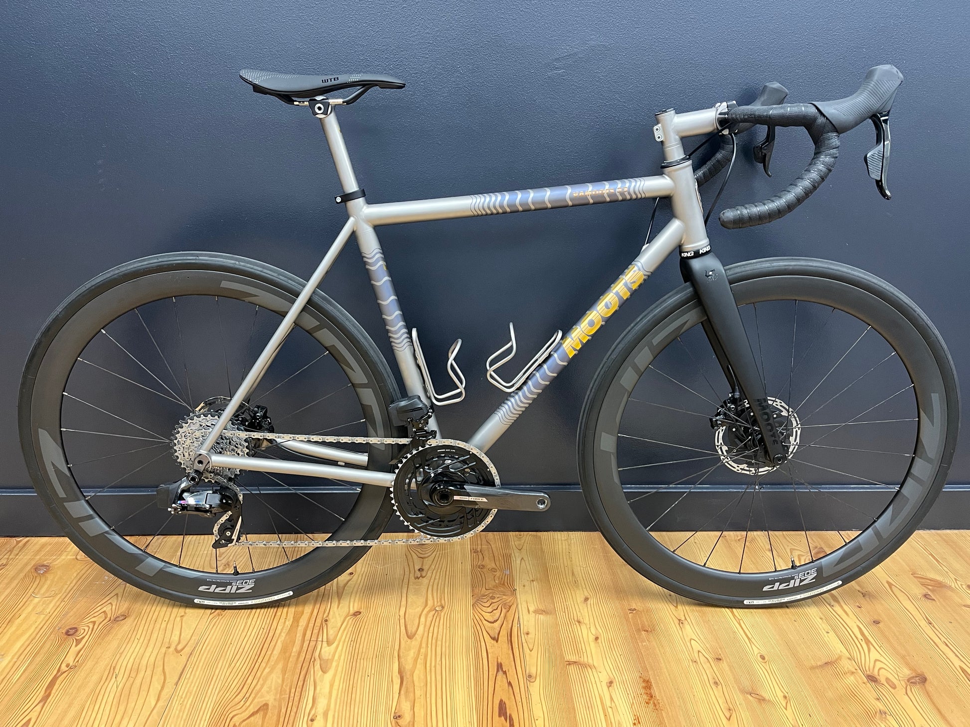 Size: 54Frame: Vamoots 33Kit: Sram Force 2x AXS roadFinish: GroundswellFork: Moots carbon RCSHeadset: Chris King Matte BlackHandlebar: Enve AR carbon 46mmStem: Moots Ti 90 x -6Seat Post: Moots Ti Straight 27.2 x 380Wheels: ZIPP 303 S carbon road tublessSaddle: WTB Gravelier SL Fusion/ Cromoly railsTires: Panaracer Gravel King Slick 700 x 32c blackBar tape: Lizard Skins DSP 2.5 black